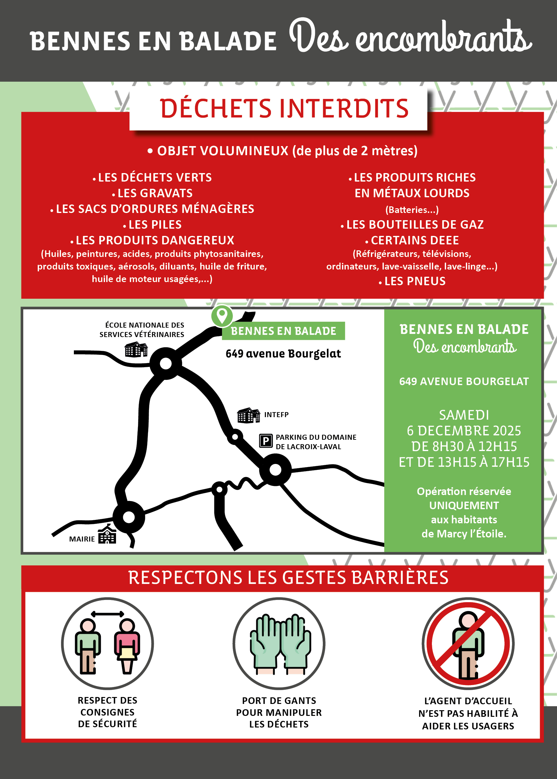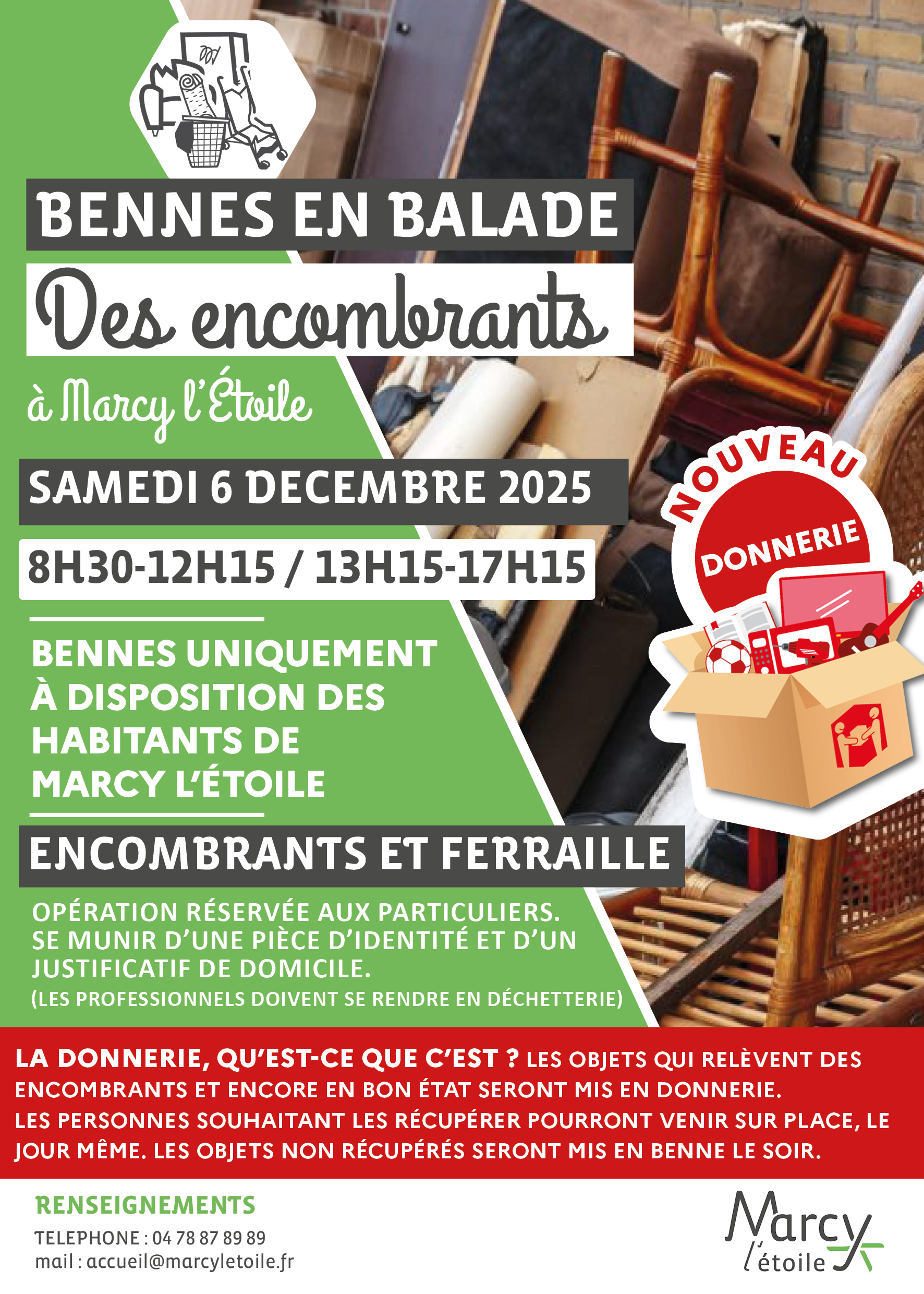 Toutefois, afin de maintenir le service, un dispositif de bennes en balade est mis à disposition des habitants de la commune de Marcy l’Etoile certains jours de l’année. L’accès est réservé aux Marcyllois, sur justification du domicile.